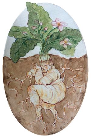 Watercolor and color pencil illustration of a Mandrake root.