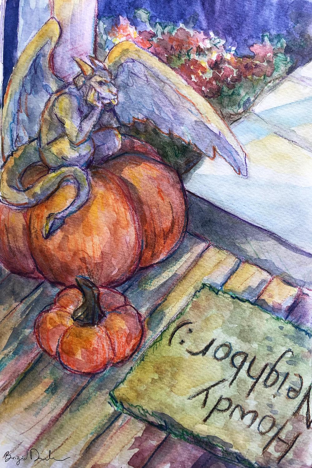 Watercolor and color pencil illustration of a pumpkin stealing porch gargoyle.